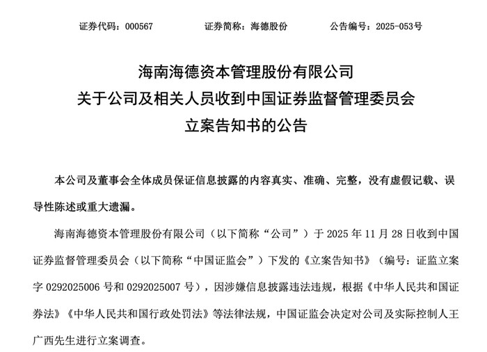 此外,海德股份也发公告称,公司于2025年11月28日收到中国证监会下发的《立案告知书》,因涉嫌信息披露违法违规,中国证监会决定对公司及实际控制人王广西进行立案调查。经自查,公司存在历史非经营性资金占用,并于2025年4月28日收到中国证券监督管理委员会海南监管局出具警示函措施的决定,该资金占用已于2025年4月24日全部归还。