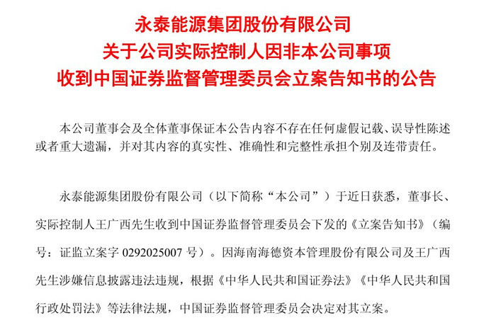 11月28日晚间,永泰能源披露公告称,公司于近日获悉,董事长、实际控制人王广西收到证监会下发的《立案告知书》。因海德股份及王广西涉嫌信息披露违法违规,证监会决定对其立案。
