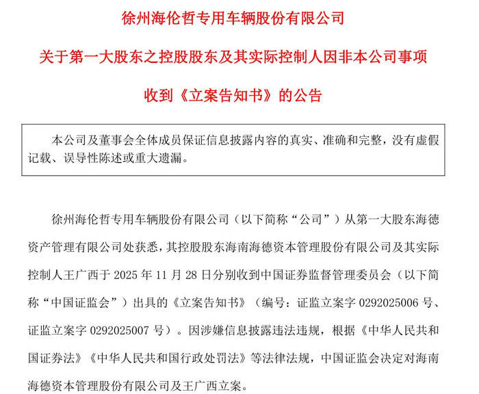 同日,海伦哲也披露类似公告称,从第一大股东海徳资产管理有限公司处获悉,其控股股东海德股份及其实际控制人王广西于11月28日分别收到证监会出具的《立案告知书》。因涉嫌信息披露违法违规,证监会决定对海德股份及王广西立案。